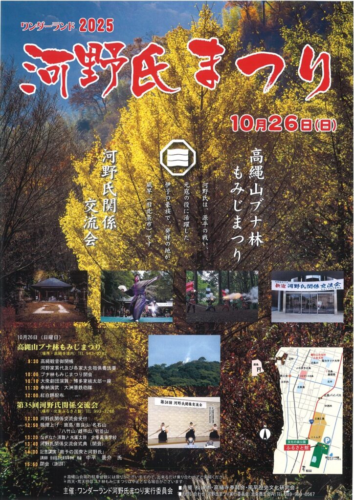 第35回河野氏関係交流会のお知らせ 2025/09/03 イベント 「第35回河野氏関係交流会」が令和7年10月26日(日)に開催されます。 午前(9:30~12:00)は高縄寺境内にて高縄山ブナ林もみじまつりが行われます。 午後(12:00~15:50)は北条ふるさと館にて河野氏関係交流会が行われます。 詳しくはチラシを確認ください。 皆様のお越しをお待ちしております。 かざはやスタンプラリー2025 新着一覧へ戻る 第28回 北条ユネスコ”小石の芸術展”