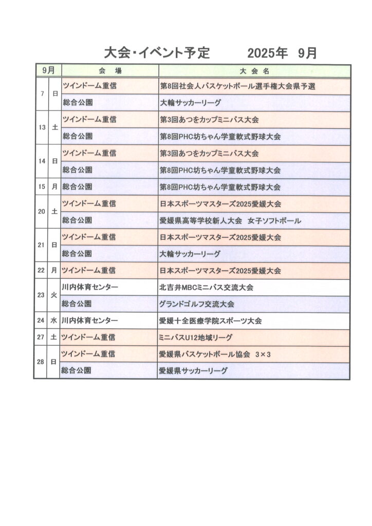 9月 大会・イベントの予定 2025/08/27 まだまだ暑い日が続きます。 体調管理に十分ご注意ください。 ツインドームのコスモスが1本花をつけましたが、 まだまだ秋は遠いようです。 熱中症注意報発令中新着情報一覧へ戻るマスターズ開催によるツインドーム利用停止のお知らせ